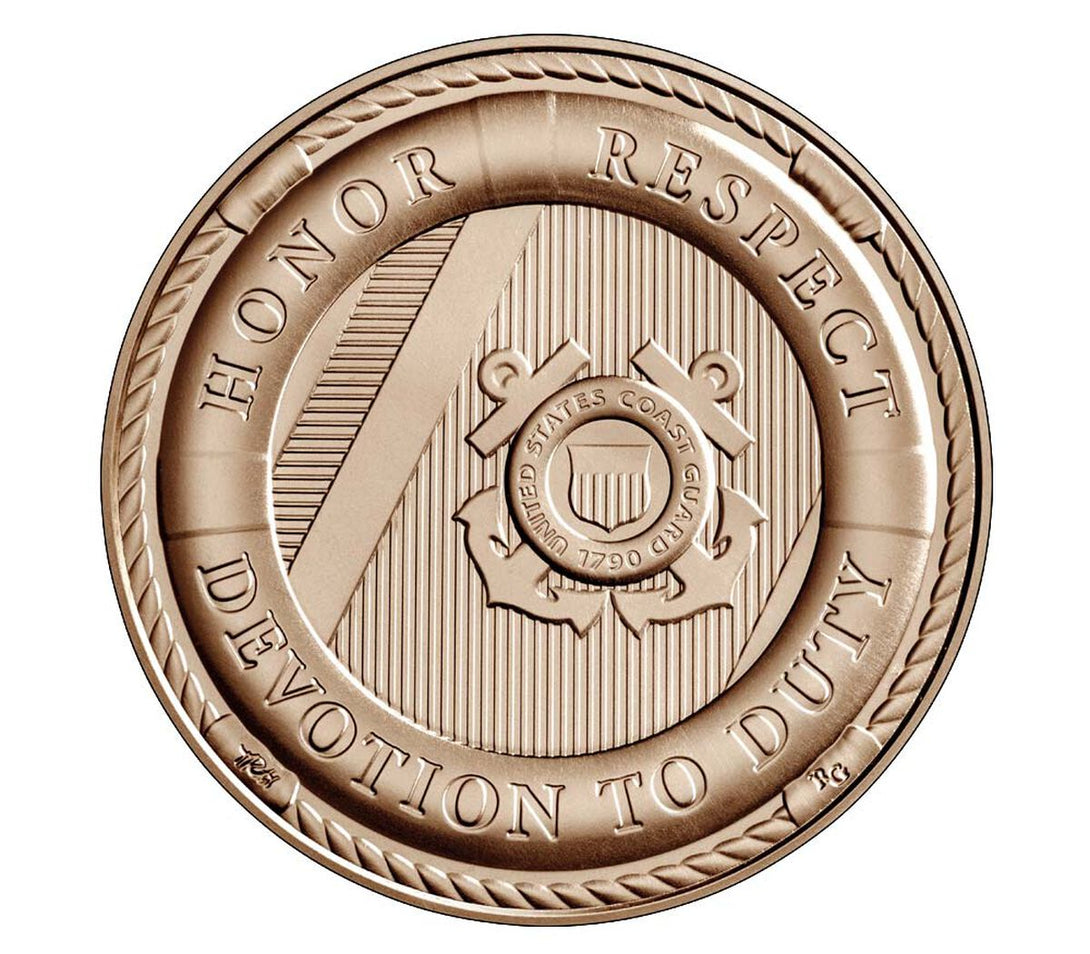 Reverse (Tails): Depicts two iconic Coast Guard symbols—a life preserver ring and the Coast Guard racing stripe mark, a design seen on nearly all Coast Guard craft. The heraldic hatching conveys colors: horizontal lines for blue and vertical lines for red. At the center lies the Coast Guard emblem, while the life preserver ring bears the inscriptions “HONOR,” “RESPECT,” and “DEVOTION TO DUTY.”