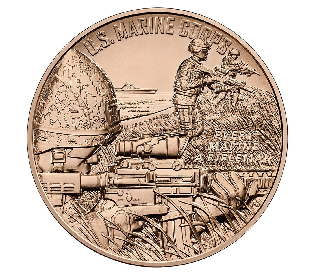 Obverse (Heads): Depicts three Marines with M4 rifles moving ashore after an amphibious landing. One Marine is concealed in the grass providing cover fire, while two advance over the hill. A U.S. warship is visible in the distance. Inscriptions read “U.S. MARINE CORPS” and “EVERY MARINE A RIFLEMAN.”