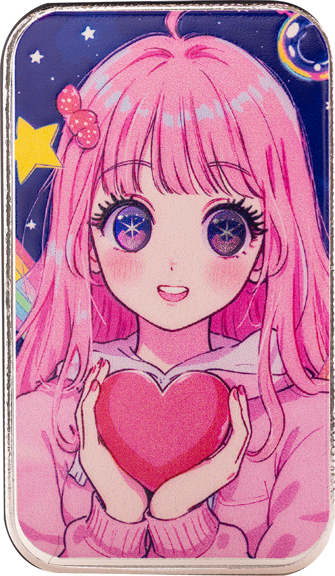 Celebrate charm and affection with the Anime Lover 1 oz Silver Color Bar from the Valentine’s Day Collection. This playful design features an adorable anime girl with vibrant pink hair, sparkling eyes, and a joyful smile, holding a bright heart close to her chest. The vivid colors and intricate detailing bring her expressive personality to life, making this piece a delightful tribute to anime culture.