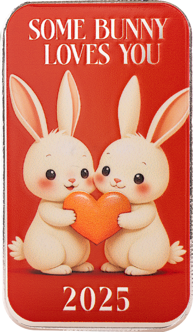 Celebrate affection with the Love Bunnies 1 oz Silver Color Bar from the Valentine’s Day Collection. This charming piece features two adorable bunnies holding a red heart, symbolizing love and togetherness. Above them, the playful phrase “Some Bunny Loves You” adds a sweet, lighthearted touch, while the rich red background enhances the warmth and romance of the design. The year “2025” is displayed at the bottom, marking it as a special keepsake for the year.