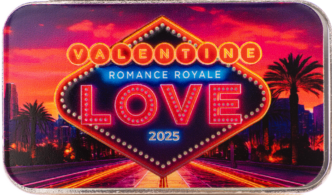 Celebrate love with a touch of glamour with the Romance Royale 1 oz Silver Color Bar from the Valentine’s Day Collection. This eye-catching piece features a vibrant depiction of the iconic Las Vegas sign, perfectly capturing the city’s glitz and excitement. Beneath the sign, the word “Valentine” is elegantly displayed, followed by “Royale Romance” in sophisticated script, with “LOVE” boldly emphasized in large, striking letters.