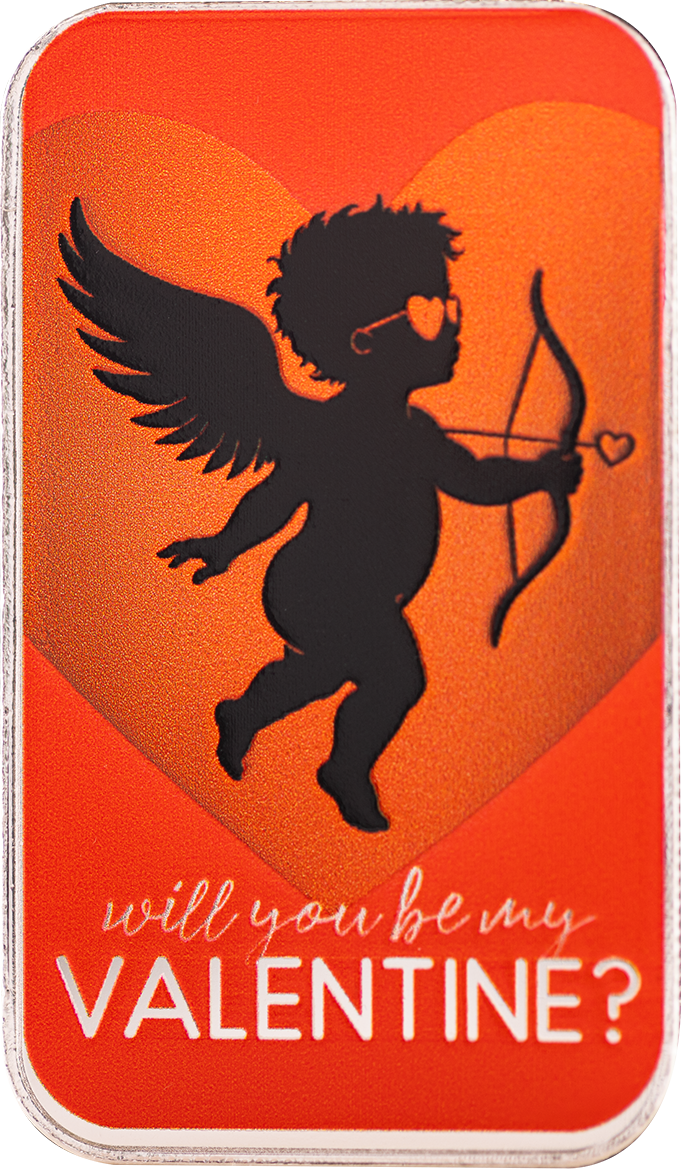 Express romance and affection with the Will You Be My Valentine 1 oz Silver Color Bar from the Valentine’s Day Collection. Set against a rich red background, this enchanting piece features a baby cupid in flight, wings outstretched and bow drawn, ready to strike with an arrow of love. Beneath the scene, the words “Will You Be My Valentine” are elegantly displayed, adding a heartfelt and romantic touch.