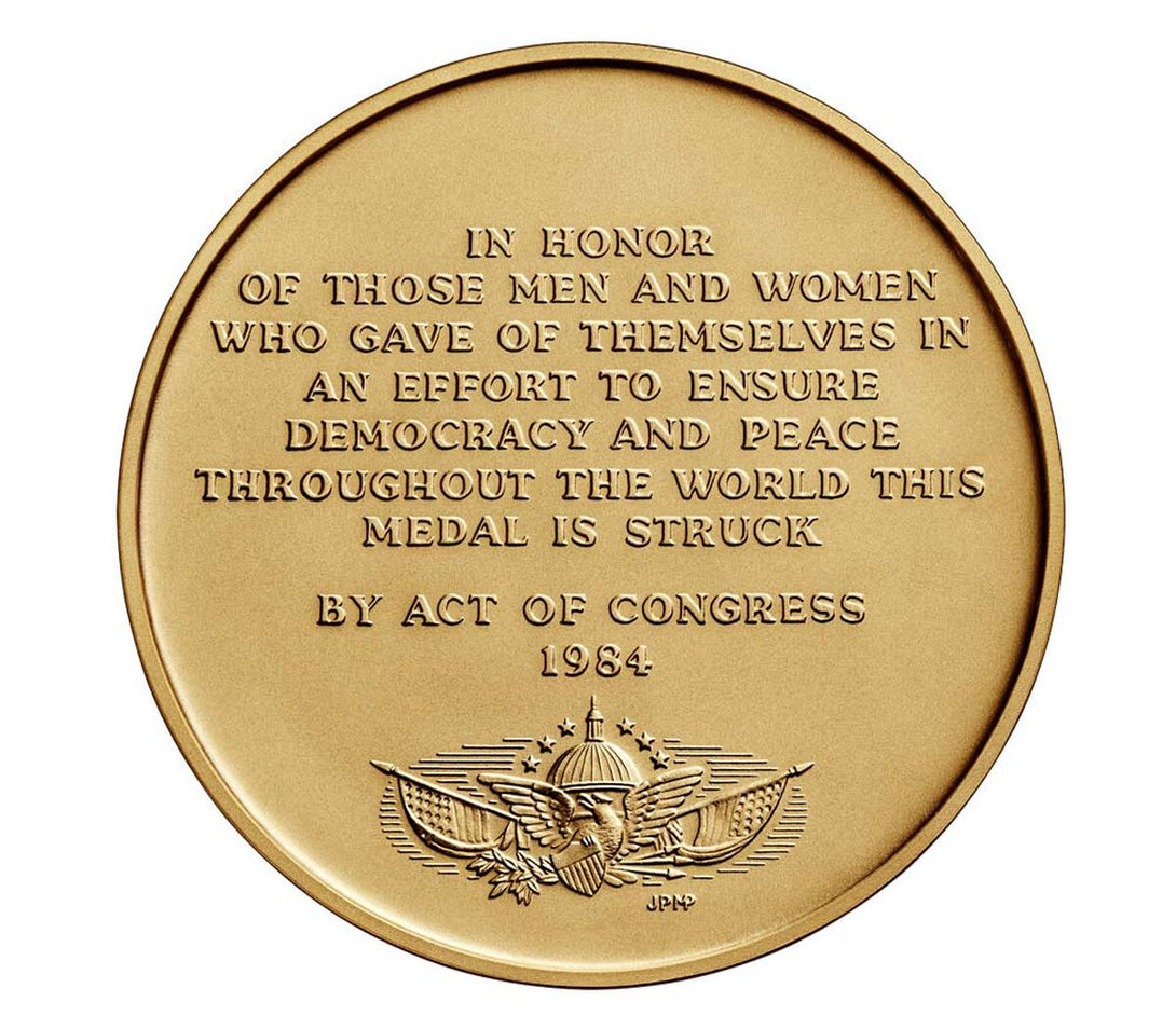 “IN HONOR OF THOSE MEN AND WOMEN WHO GAVE OF THEMSELVES IN AN EFFORT TO ENSURE DEMOCRACY AND PEACE THROUGHOUT THE WORLD THIS MEDAL IS STRUCK BY ACT OF CONGRESS 1984.”