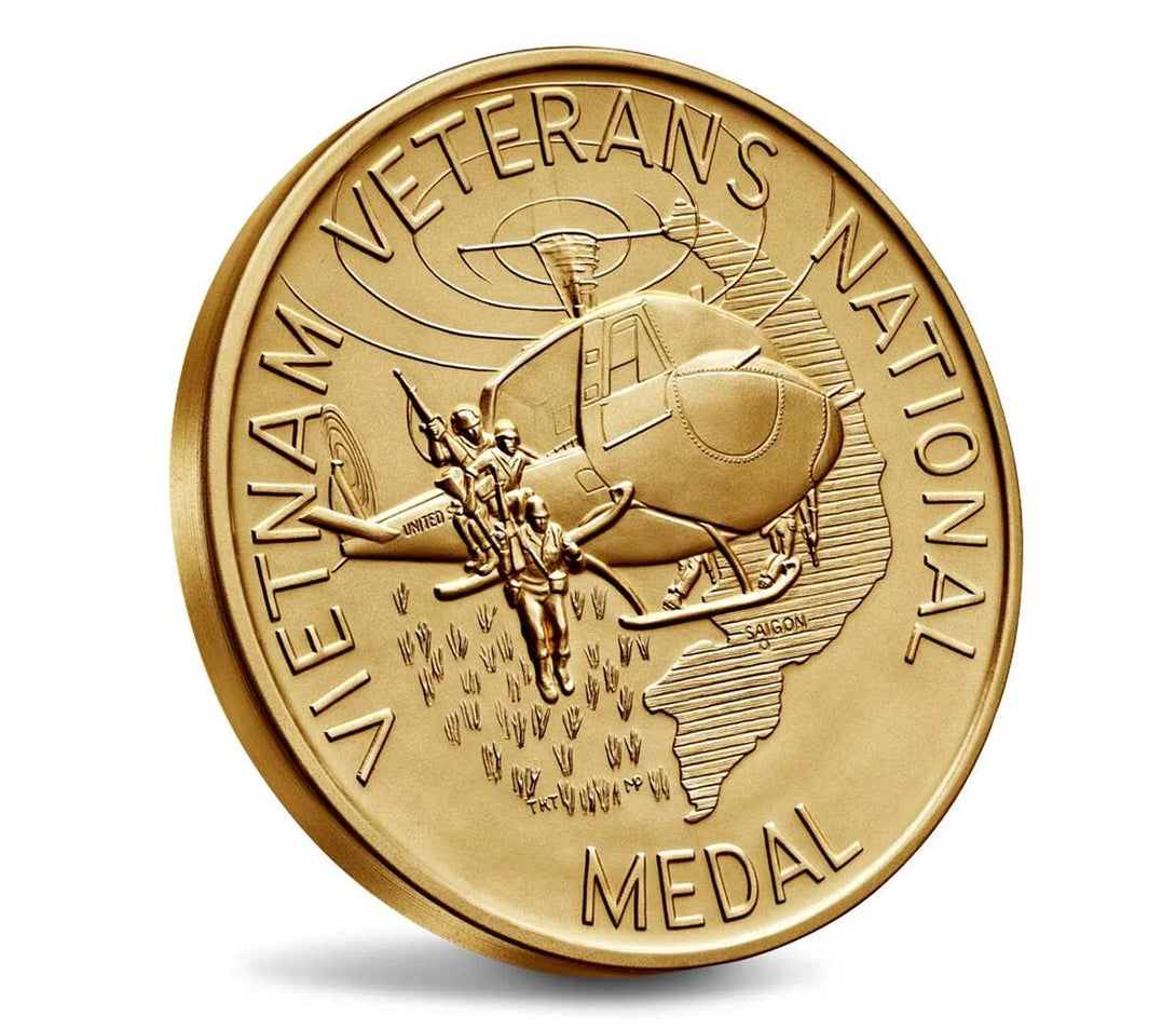 Obverse (Heads): Depicts U.S. combat troops in a helicopter assault operation, with the helicopter and soldiers superimposed over a map of Vietnam. Encircling the design is the inscription “VIETNAM VETERANS NATIONAL MEDAL.”