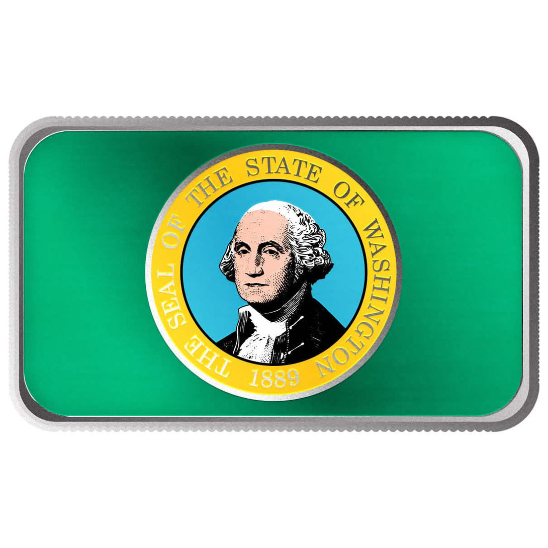Add the Washington State Flag Silver Bar to your collection and celebrate the heritage, natural splendor, and pride of the Evergreen State.