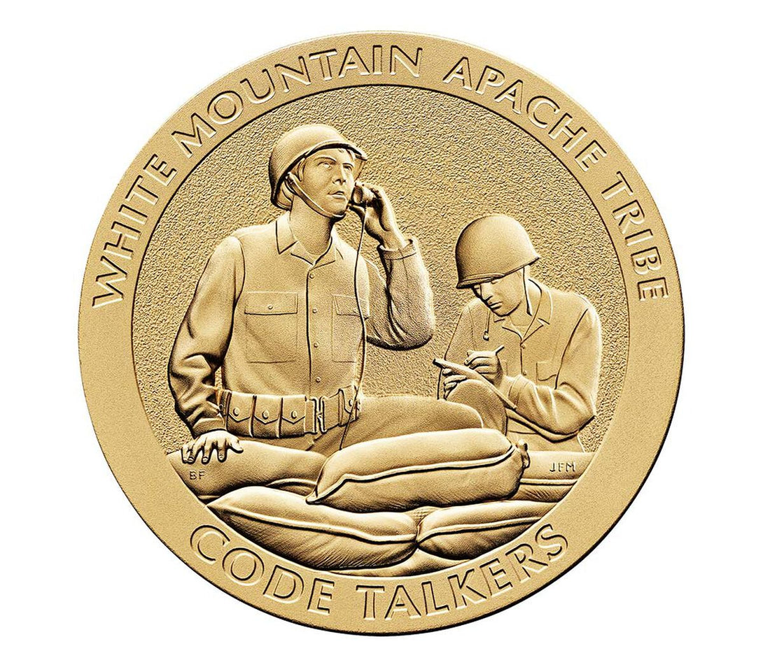 Obverse (Heads): Depicts Code Talkers behind sandbags; the foreground Code Talker is using a field phone to deliver a message, while the one in the background writes the coded message. Inscriptions: “WHITE MOUNTAIN APACHE TRIBE” and “CODE TALKERS.”
