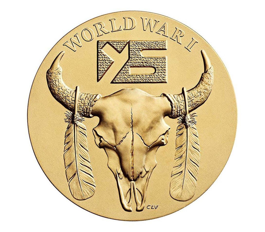 Reverse (Tails): Displays a variation of the buffalo skull, painted in honor of Yankton Sioux Tribe veterans, with the inscription: “WORLD WAR I.”